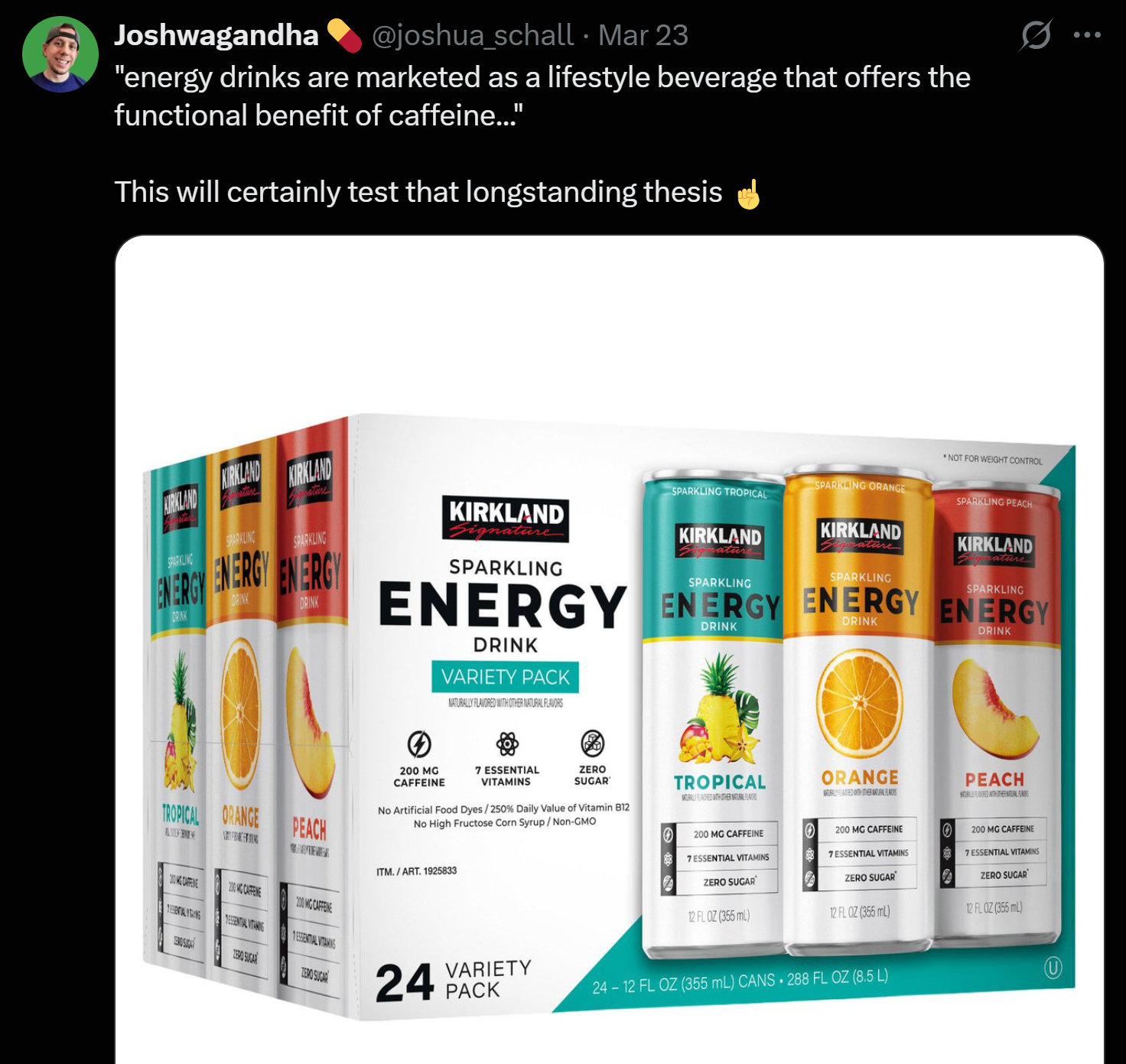 But when trying to decide if these Kirkland Signature energy drinks can truly disrupt CELSIUS, it likely hinges on if Gen Z and Millennial women break historical patterns on categorical consumer behavior. While a 25-year-old Sophia (living in Austin, TX) might drink the “CELSIUS dupes” in private…is she willing to confidently carry a can of Kirkland Signature energy drinks in public everyday?